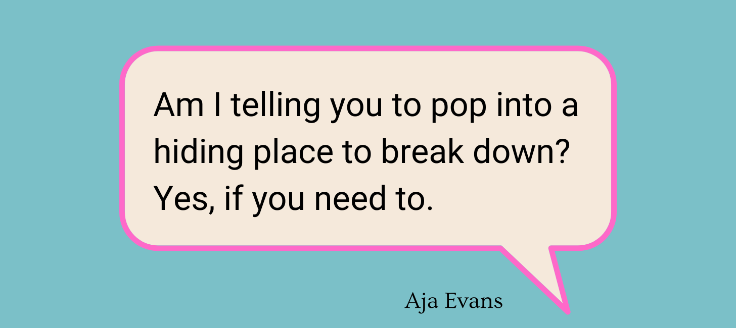 I want you to give yourself as much space and time as you can to acknowledge the hurt, sit with it, breathe through it, cry, and put it some place safe inside of you when you can more fully experience your feelings. Am I telling you to pop into a hiding place to break down? Yes, if you need to, and no, you don’t have to hide it if you don’t want to. Because it is insane!