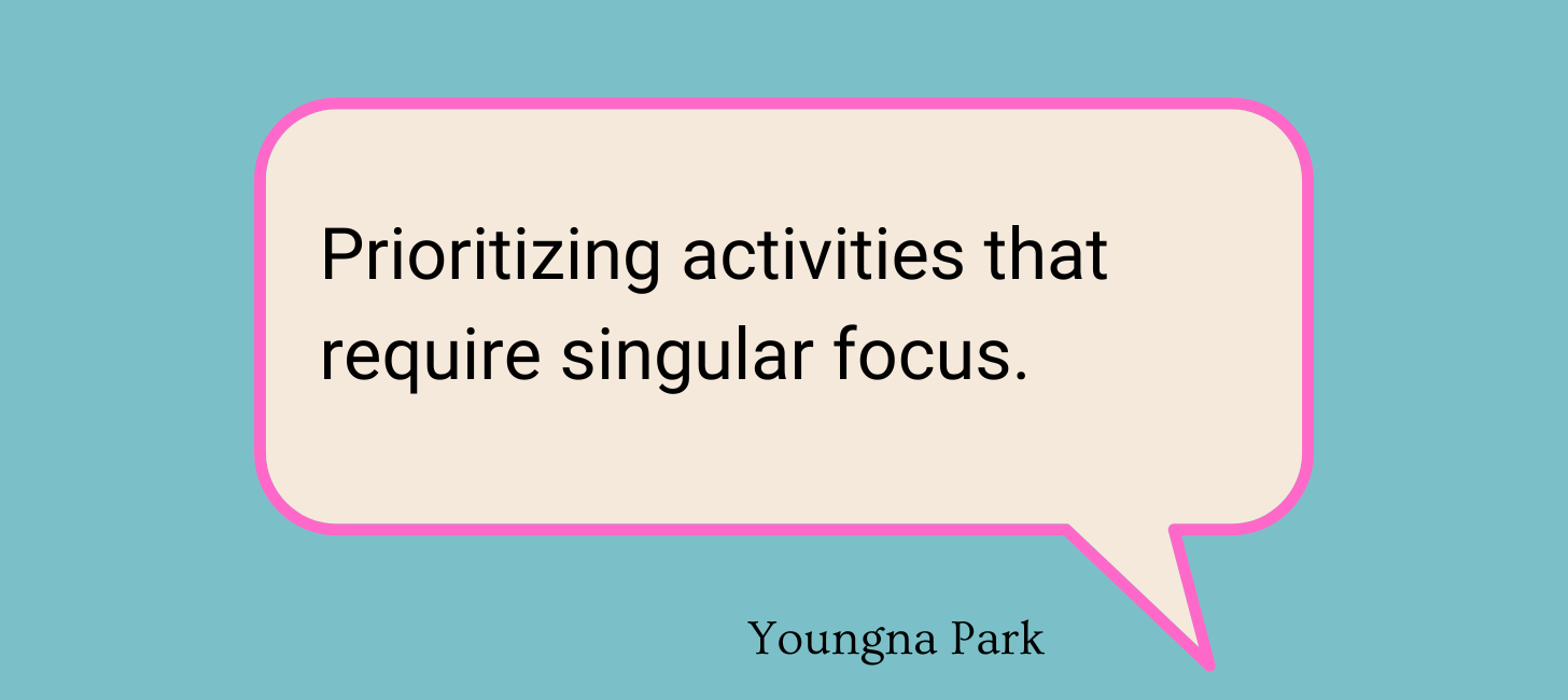 My primary means of coping is by prioritizing activities that require singular focus—things that absolutely cannot be done while multi-tasking. For me, these two activities are reading (books) and playing tennis. Both have required my building conscientious attention stamina, and both allow me to escape thinking about everything else. I think tennis could be replaced by a lot of other physical or tactile hobbies, like gardening, making art, other sports, etc. My kids now understand if I’m reading or going to play tennis, they must not interrupt me! It’s sacred time.